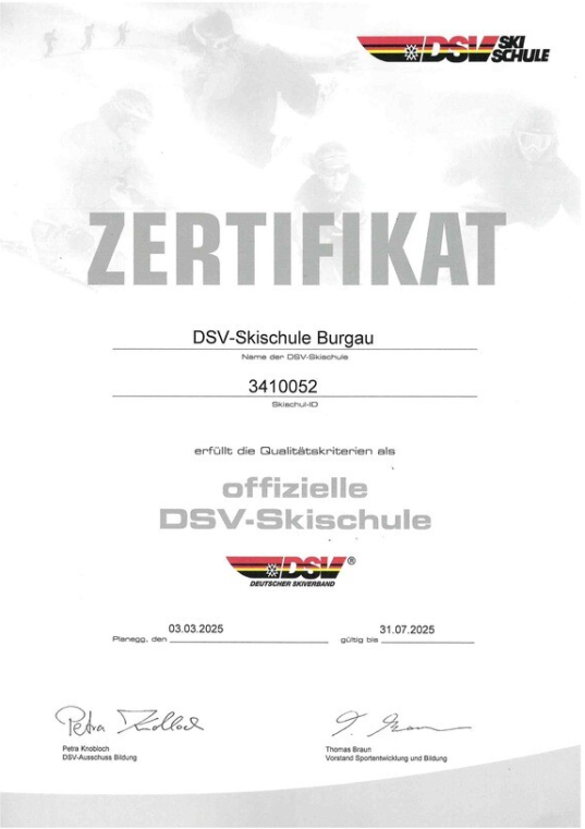 Der Ski-Club Burgau hat wieder eine DSV-Skischule! Bereits vor über 25 Jahren gründete der Verein als einer der ersten Ski-Clubs in Bayern eine DSV-Skischule. Als eine von rund 350 DSV-Skischulen stehen wir künftig noch mehr für Qualität im Ski- und Snowboardunterricht. Um die Lizenzierung zu erhalten, mussten wir mehrere Qualitätskriterien erfüllen und werden jährlich durch den Deutschen Skiverband lizenziert. Die hohe Qualität unserer Lehrkräfte garantiert ein kunden- und zielgruppenorientiertes Angebot an Schneesport-Kursen auf hohem Niveau.